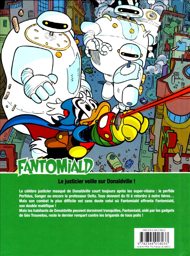 Voici le troisième tome consacré au super-héros de Donaldville, j’ai nommé Fantomiald. Des histoires tirées de la série italienne de magazines Disney (Fantomiald a été crée en 1969 par des auteurs italiens) qui sont bien conformes à la ligne des publications Disney. Notre héros, alter ego de Donald, court et se démène tous azimuts, combattant les méchants les plus improbables! des robots indestructibles, des savants maléfiques, etc.