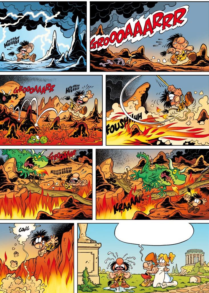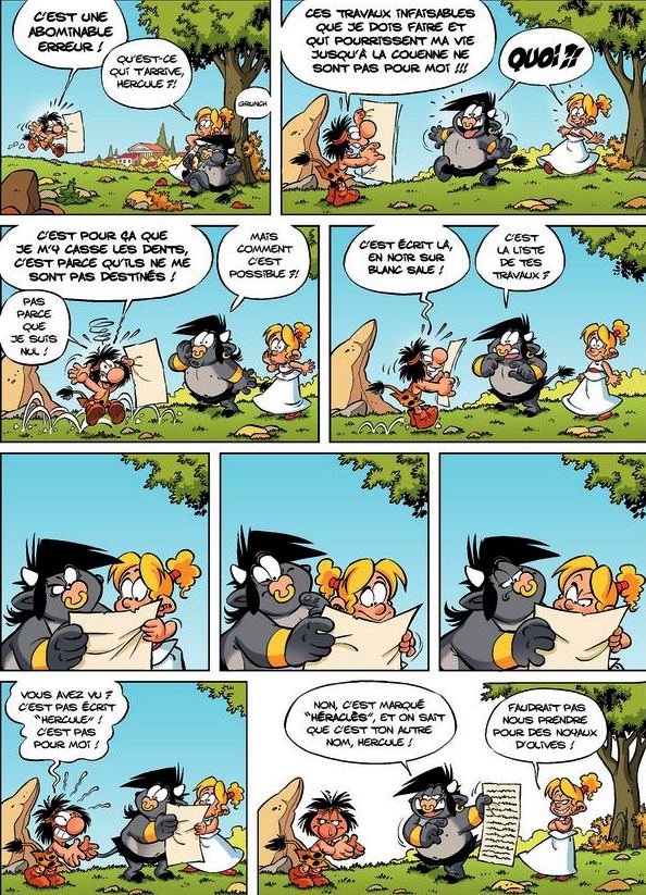 Les doubles pages d’ouverture et de fermeture de l’album font le point sur les 12 travaux, sous l’intitulé mythologéo, pour préciser les contextes géographiques antiques et actuels des exploits du plus célèbre héros de la mythologie grecque. Un dossier pédagogique de 8 pages, particulièrement précis et accessible au niveau informatif vient ensuite compléter une série de gags sans réelle surprise, mais toujours frais et distrayants à la lecture.