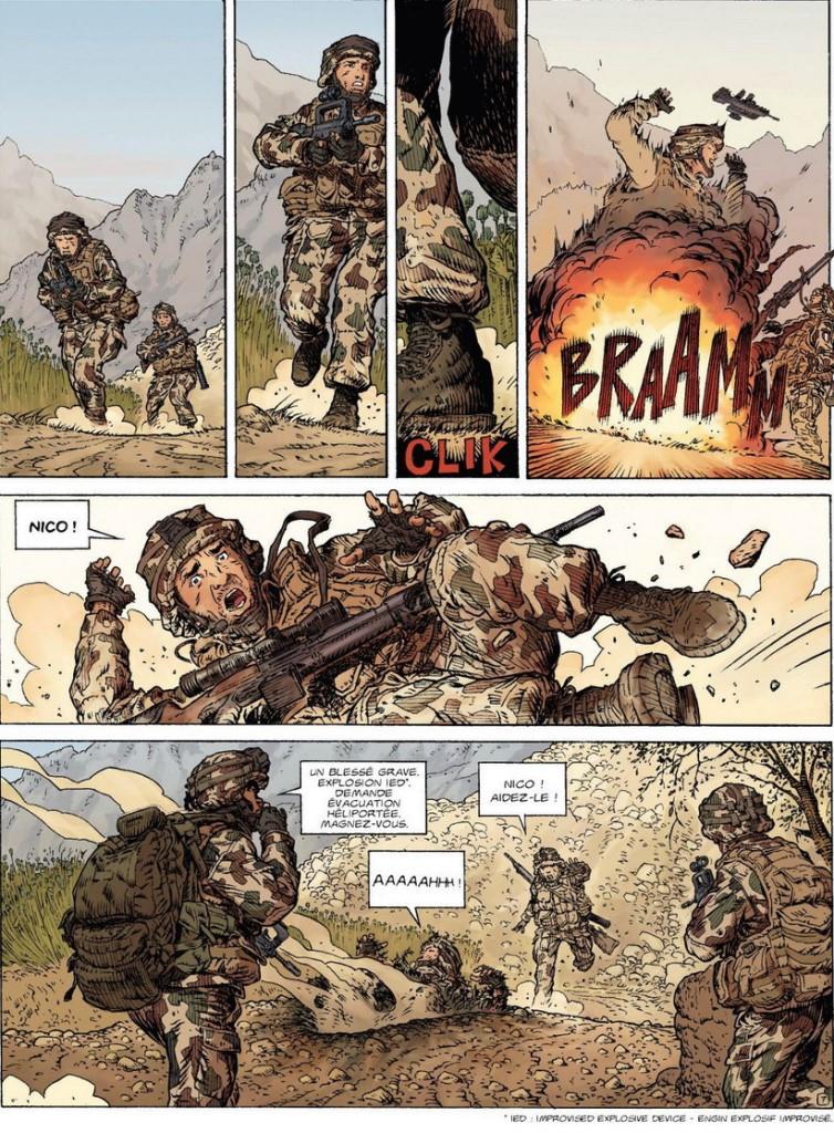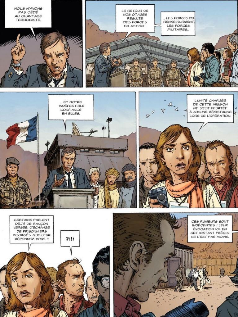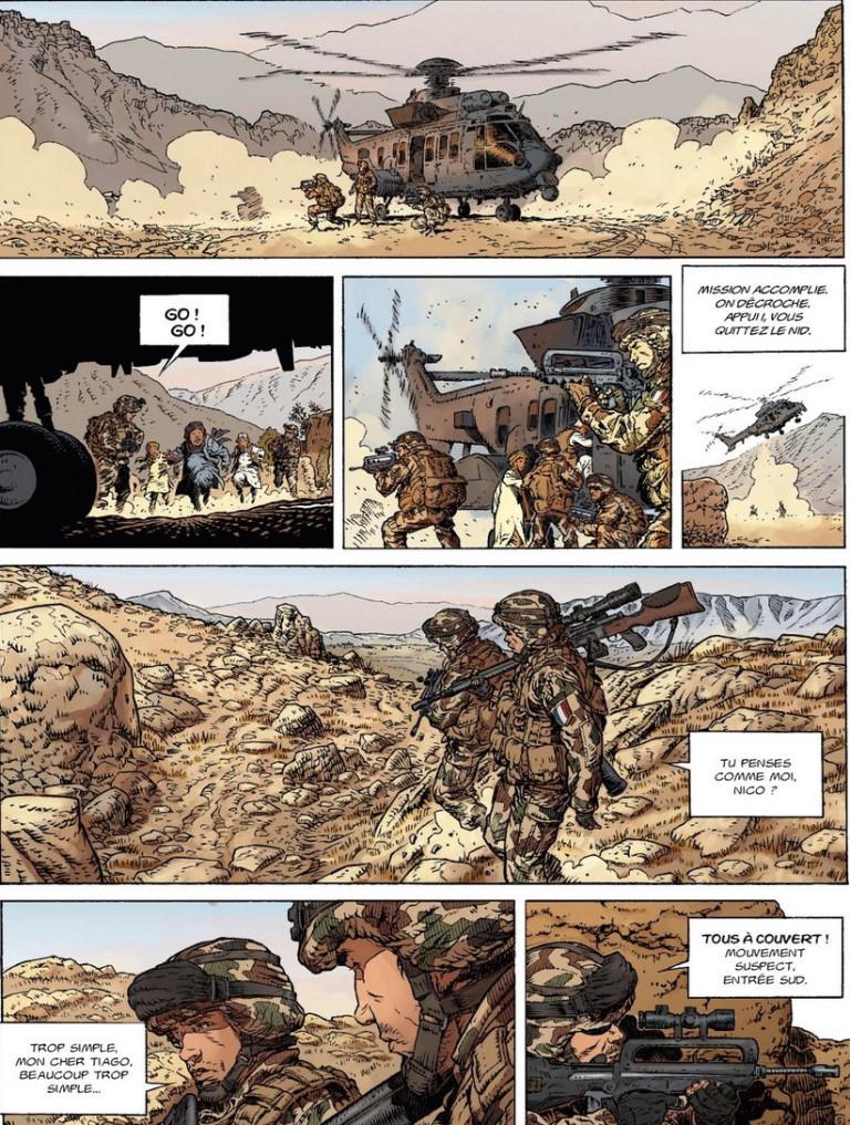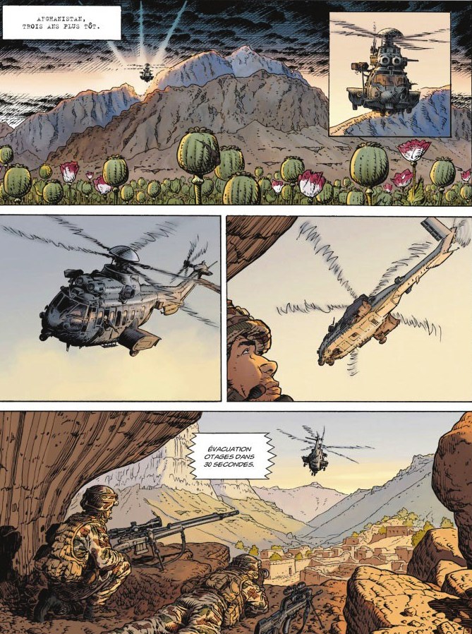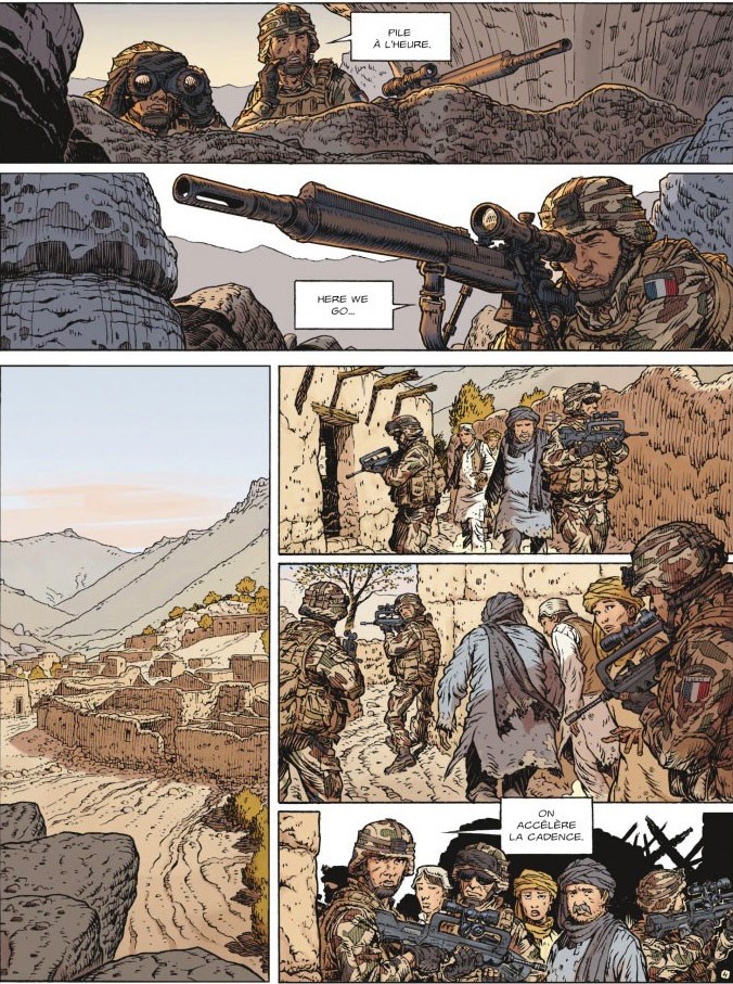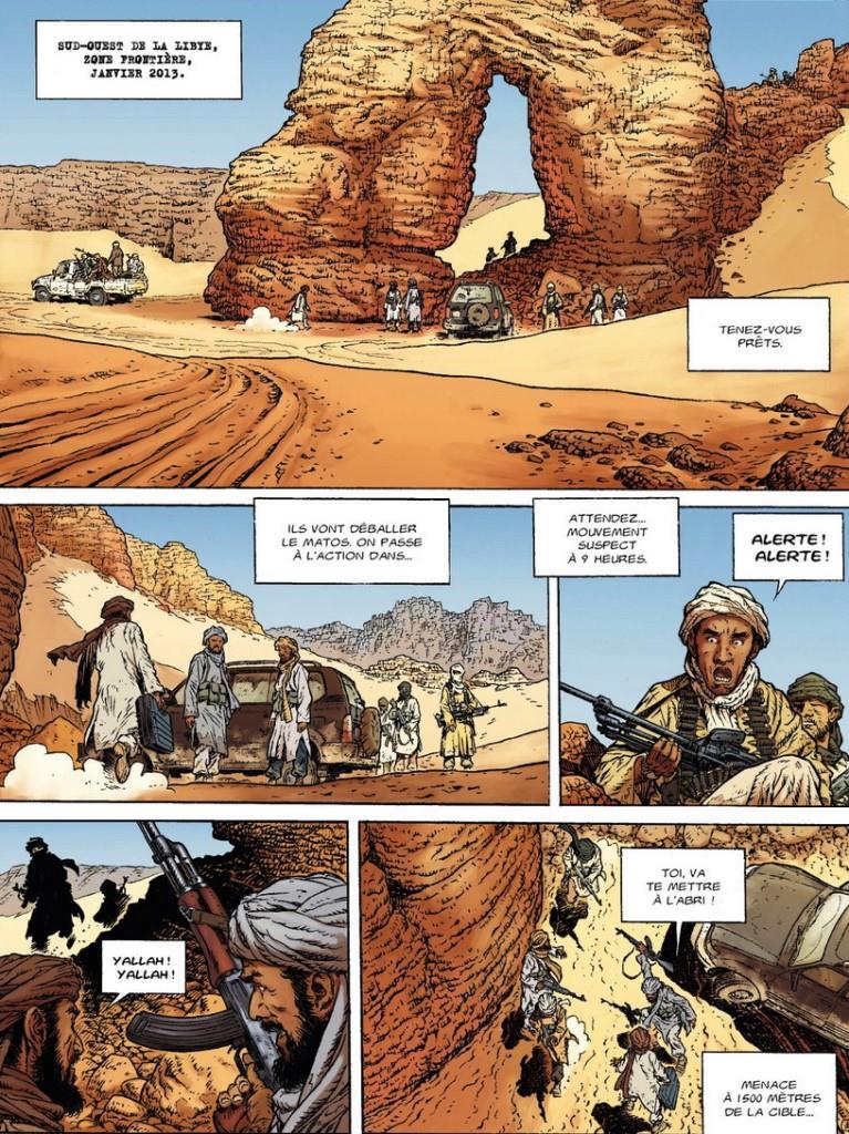 Le scénario mise sur le récit d’une vengeance qui vise un certain Zimmer. Il fait voyager le lecteur en Afghanistan, en Lybie, au Mali, au Maroc, en France et au Botswana dans des situations parfois périlleuses. Le décor est planté, la problématique développée et les personnages présentés. C’est bien construit au niveau de la forme narrative. Mais pour un récit qui se veut réaliste, je serai plus critique sur le fond : des dialogues parfois consternants relevant des clichés les plus éculés et des situations géopolitiques parfois caricaturales : l’arrestation par le commando de mercenaires de quelques pauvres braconniers mal armés au Botswana, par exemple.