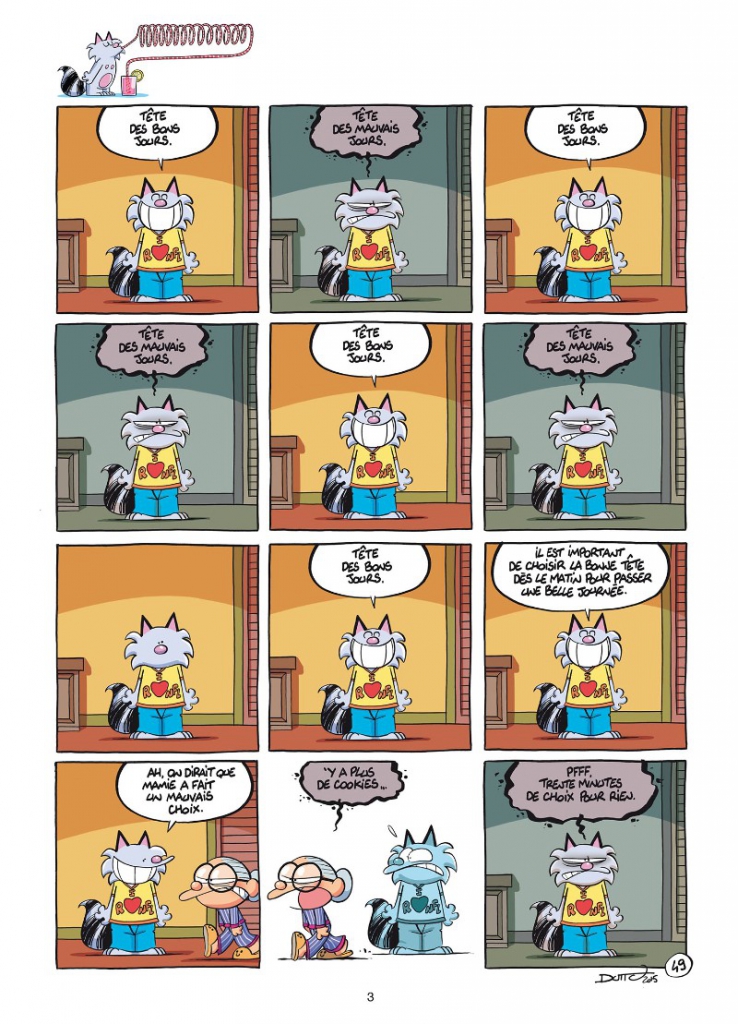 Et tadammm, elle me coupe directement lors du débriefing en me disant que c’est vraiment pas un album marrant avec des gags qui tombent souvent à plat. J’ai un petit doute et je lis quelques pages de cet album et effectivement c’est vraiment pas terrible. Allez, on range vite le nœud pap et les cookies et oublions vite ce pauvre album loin d’être irrésistible !