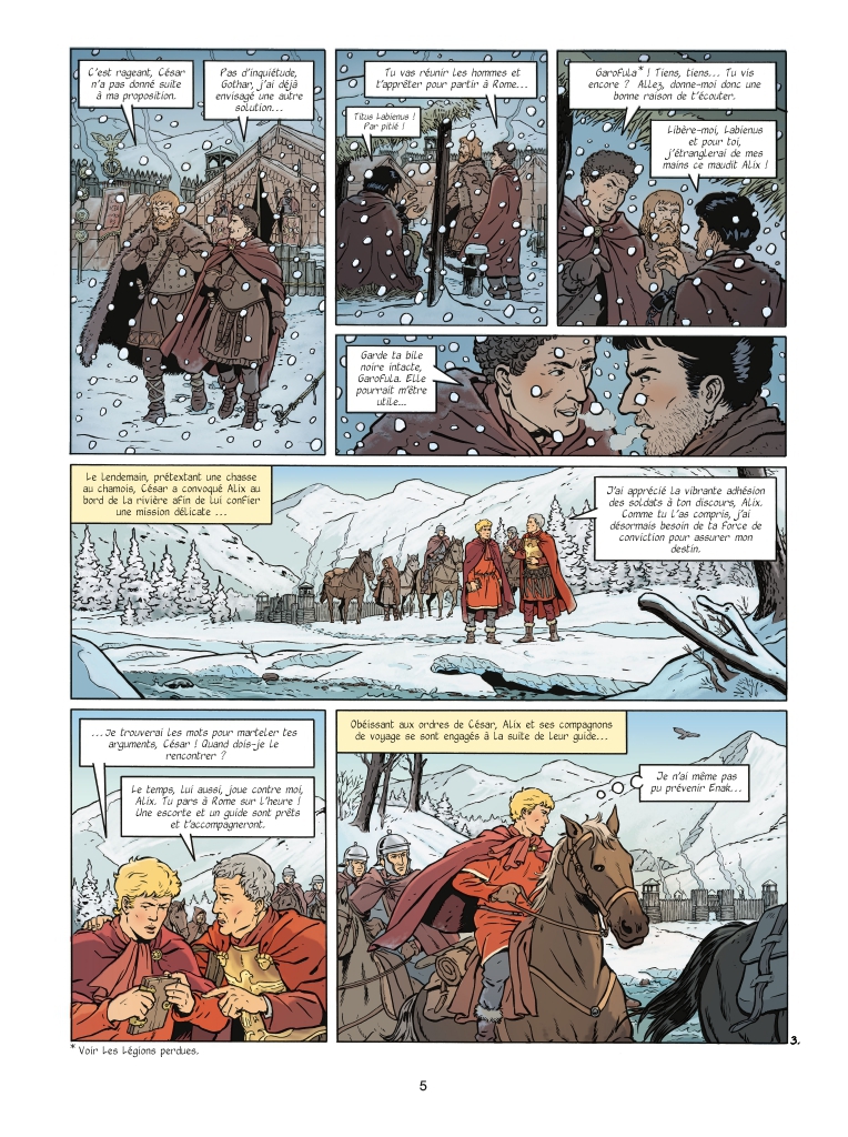 Pour les fins historiens, la guerre civile romaine n’est pas loin : À vrai dire, Alix se retrouve messager du grand César – qui revient en Italie après la conquête de la Gaulle – afin de pouvoir retrouver sa chère Rome, en tant que consul aux côtés de Pompée. L’Histoire nous apprend que l’un comme l’autre demandaient le démantèlement des armées de chacun, en guise de bonne entente.