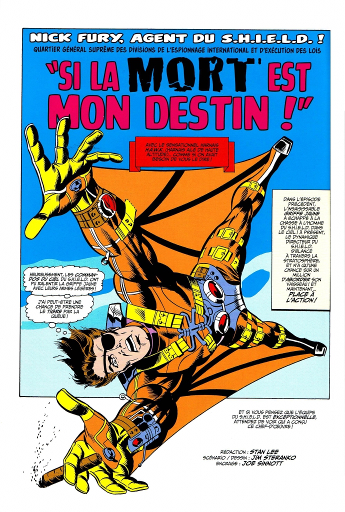 Stan Lee était, en 1966, en pleine création de son fameux univers de super-héros, avec des personnages devenus incontournables comme Spide-Man, Hulk, Iron man, ect. Il décide d’inclure à cette panoplie le sergent Nick Fury dont les aventures se passent pendant la deuxième guerre mondiale. Il en fait un colonel à la retraite à qui le gouvernement va proposer la création d’une organisation de contre-espionage, le S.H.I.E.L.D. Au début les épisodes sont dessinés par le grand (immense même) Jack Kirby. Puis Lee propose du travail à un jeune artiste plein de talent, Jim Steranko!