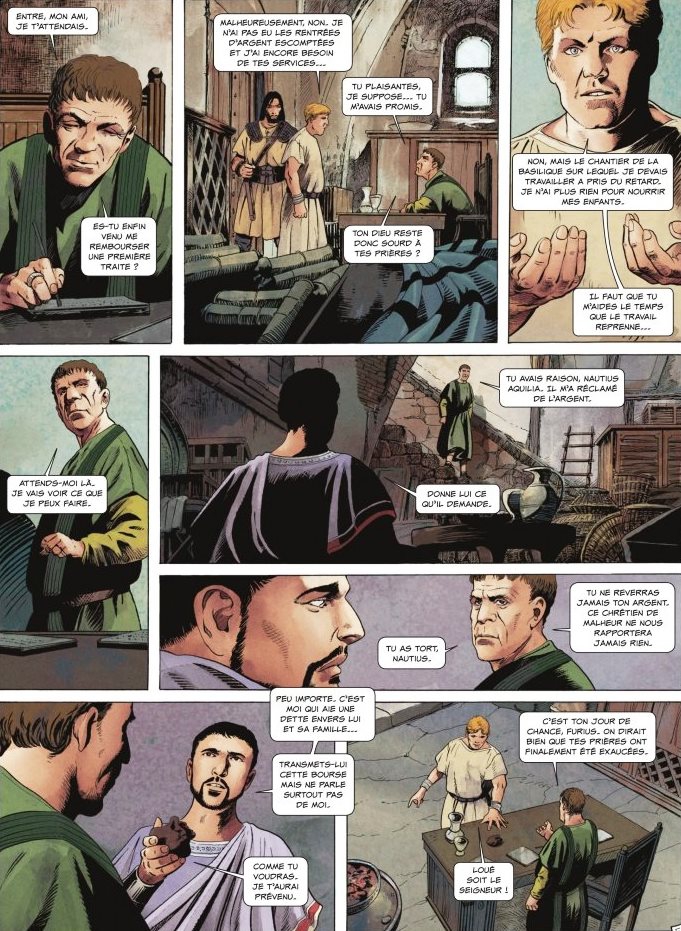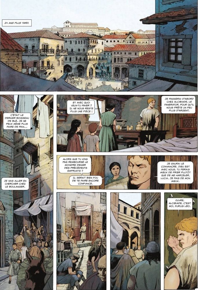 Du côté du travail des scénaristes, mon point de vue n’a pas varié : le mélange de BD historique avec un récit fantastique passe parfois difficilement. Même si l’époque était très réceptive aux croyances et superstitions, parfois complètement extravagantes, l’association de ces deux genres ne me semble pas vraiment pertinente. C’est sans doute mon intérêt pour la culture antique traditionnelle qui conditionne ma lecture. Par ailleurs, l’éclairage historique du professeur Bertrand Lançon en fin de tome vient contrebalancer ma perception. Une fois de plus, son dossier apporte nuances et précisions sur le contexte, ce qui invite à une relecture plus attentive et plus sensible à la démarche des auteurs. La série est donc intéressante et ouvre des possibilités de questionnement sur l’état de nos connaissances historiques des grandes étapes de l’histoire romaine. Cette stimulation à la réflexion critique agrémente un récit dessiné de manière académique et dont la lecture reste un bon moment de plaisir.