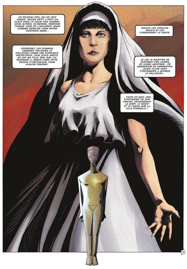 306. Constantin Ier règne sans partage sur un empire s’étendant de la mer du Nord à l’Orient. Samère, Hélène, fervente chrétienne, le pousse à la conversion et à imposer la religion du Dieu unique à tous ses citoyens. Les familles Leo et Aquila sont toujours les gardiennes et les garantes de la stabilité du Palladium, mais elles doivent désormais célébrer leur culte de manière clandestine. L’Empereur vient de fonder une seconde capitale pour l’Empire Romain d’Orient : Constantinople. Sous la pression de sa mère, il impose la religion chrétienne. Pour ce faire, il crée auprès des Romains un épouvantail qui les poussera à embrasser sa foi : il invente le Diable ! Il trouve dans l’antique culte du Palladium un bouc émissaire tout indiqué, et monte une machination pour désigner cette ancienne croyance, ainsi que ses adorateurs, à la vindicte populaire. Mais Ker, la déité prisonnière de la statue, usera de tous ses pouvoirs maléfiques pour briser les plans de l’Empereur…