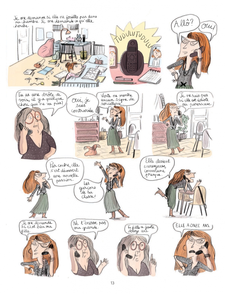 Les personnages sont très « typés » à la limite de la caricature, mais j’ai franchement du mal avec ce type de dessin. De même que tout le texte en manuscrit : Allo ?! Je sais que c’est narré par une gamine de 11 ans, mais quand même…