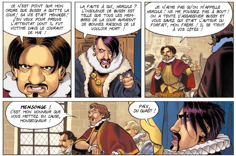 La partie graphique est tout simplement exceptionnelle. Dans un style moins réaliste que sur la série Le Chant des Stryges, il fait ici le choix d’un style semi réaliste offrant toutefois un trait tout autant précis et expressif. Mais ce que l’on retiendra le plus, c’est sa capacité à varier les styles en nous proposant à 3 ou 4 reprises une rupture graphique, comme il l’avait fait dans Charly 9. D’abord avec deux planches en début d’ouvrage qui imitent la collection L’histoire de France en bande dessinées des éditions Larousse des années 70, et qui illustrent de façon limpide les bases du récit qui va suivre : la succession de Charles IX, la fuite de Pologne d’Henri III, les différentes factions en lice dans les guerres de religions. Ensuite, et pour illustrer une anecdote plus légère, l’auteur signe deux planches de l’avatar Dick Gerwin dessinant à la façon de Dik Brown l’auteur des strips de Hägar Dünor. Enfin, ultime imitation et hommage où sur 6 pages l’auteur nous narre la bataille de Coutras à la façon de Tardi dans ses nombreux albums sur la guerre de 14-18 : larges cases panoramiques sur fond rouge et violence explicite des combats. Autant de pauses graphiques et narratives qui permettent de prendre un peu de recul ou de hauteur sur les évènements racontés.