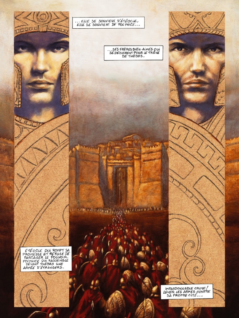 Classique parmi les classiques de la littérature, le texte de Sophocle connaît ici une adaptation en bande-dessinée qui met en valeur sa dramaturgie tout en gardant l’essentiel de son message philosophique. Particularité de ce travail graphique, c’est qu’il a été entièrement réalisé sur bois : des planches du théâtre aux planches de BD sur planches de bois ! Cela donne au livre une force visuelle étonnante que vient encore renforcer le hiératisme théâtral des personnages, les crayonnés et les couleurs sombres. L’aspect tragique du conflit est ainsi souligné, le jeu des masques magnifié.
