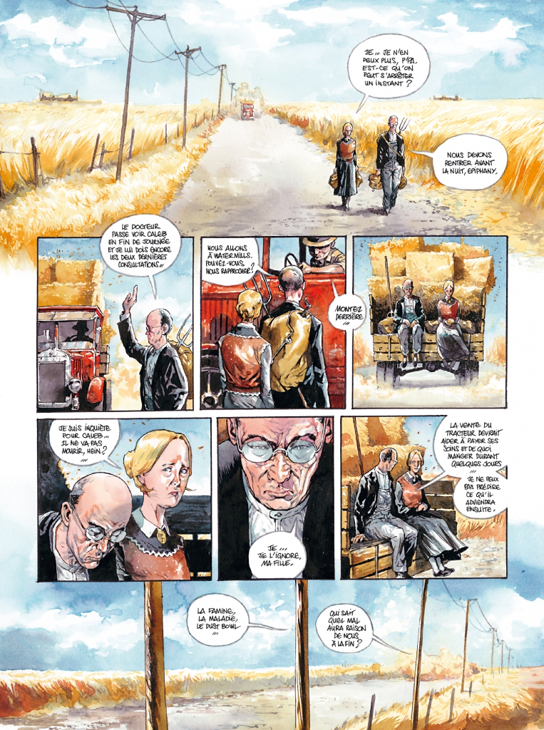 Les scénaristes Alcante et Gihef ont su nous faire ressentir le climat de haine, de misère et de tristesse de cette époque et nous font penser souvent au merveilleux film de John Ford d’après Steinbeck, « Les raisins de la colère » (bon ils ont dû se souvenir aussi de la scène du barbecue dans le premier « La nuit des morts-vivants). De son côté, l’artiste Stéphane Perger, sait rendre les personnages encore plus sombres et sordides; ses visages sont déformés par la faim et la misère et la violence se lit sur tous les traits. La couleur, dominée par les gris, le jaune et le rouge, apporte une odeur rance de sang et de mort.