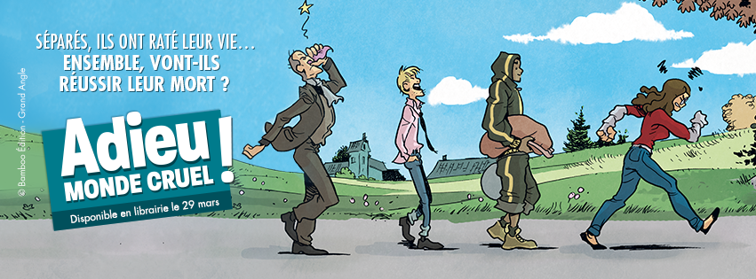 Bon, je ne pensais pas que chroniquer une BD avec une histoire aussi simple serait aussi ardu, voire délicat. J’ai, à vrai dire, beaucoup de difficultés à dire du mal d’une BD. Pas par lâcheté, non, mais tout simplement parce que, quoique je puisse en penser, Les auteurs ont investi du temps, de leur personne et beaucoup de travail pour arriver à produire leur œuvre. Mais bon, je dois bien admettre que « Adieu monde cruel » ne m’a pas vraiment retourné. Le pitch est sympa et possède un bon potentiel mais l’histoire ne décolle pas plus que ça. Une bluette, en quelque sorte…