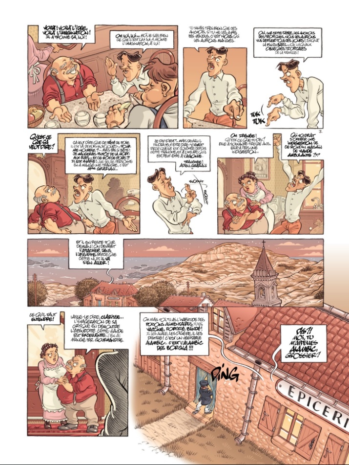 D’abord, niveau scénario, les auteurs ont bien fait quelques petites coupes ET quelques rajouts (ils sont partis du script du film et non du film lui-même) par rapport au film, mais tout ce qu’on lit est de Pagnol. Sa plume et sa verve font mouche, dans les dialogues plus que tout. Un esprit chagrin autre que le mien pourrait relever, voire regretter, des différences de plus en plus marquées entre la BD et le film au fil de la lecture. Comme si les auteurs avaient eu dans l’idée de coller au film au début du projet pour ensuite s’apercevoir que ce n’était peut-être pas si nécessaire que cela. Mais bon, rien de bien méchant non plus…
