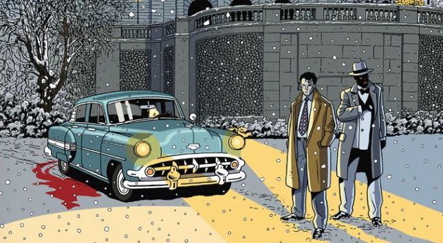 Voici un polar efficace servi par une ligne claire très agréable. Les auteurs nous entraînent dans les années 50, à une époque où il neigeait encore au mois de novembre sur Paris et sa banlieue, pour une histoire se déroulant dans l’arrière-cours du divertissement à la parisienne, des clubs de jazz et autres boites de nuit en vue de Pigalle et ses alentours. On y croise des flics un peu limite, des malfrats plutôt racistes (enfin, de ce qui se faisait à l’époque…), des gros bonnets intraitables et cruels, des gros bonnets avec un peu plus d’éthique, Jean-Pierre Melville, un clochard aussi héroïque que mystérieux, des mitrailleuses et des grosses voitures chromées. Le tout sous une pluie quasi incessante.