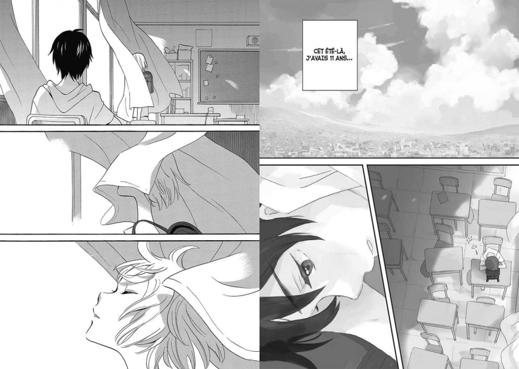 Ce one-shot, d’un superbe graphisme comme je les aime – à la fois empli de simplicité et pourtant tellement bien détaillé – fait partie de ces œuvres qui vous font réfléchir au monde dans lequel nous vivons à travers le regard de trois enfants (car je ne vous l’ai pas dit, mais Rio a un petit frère omniprésent dans l’histoire). Pas seulement la vision de notre société sur les gens en marge, mais aussi – et surtout – l’image d’un père absent tant pour Natsuru orphelin de père, que Rio.