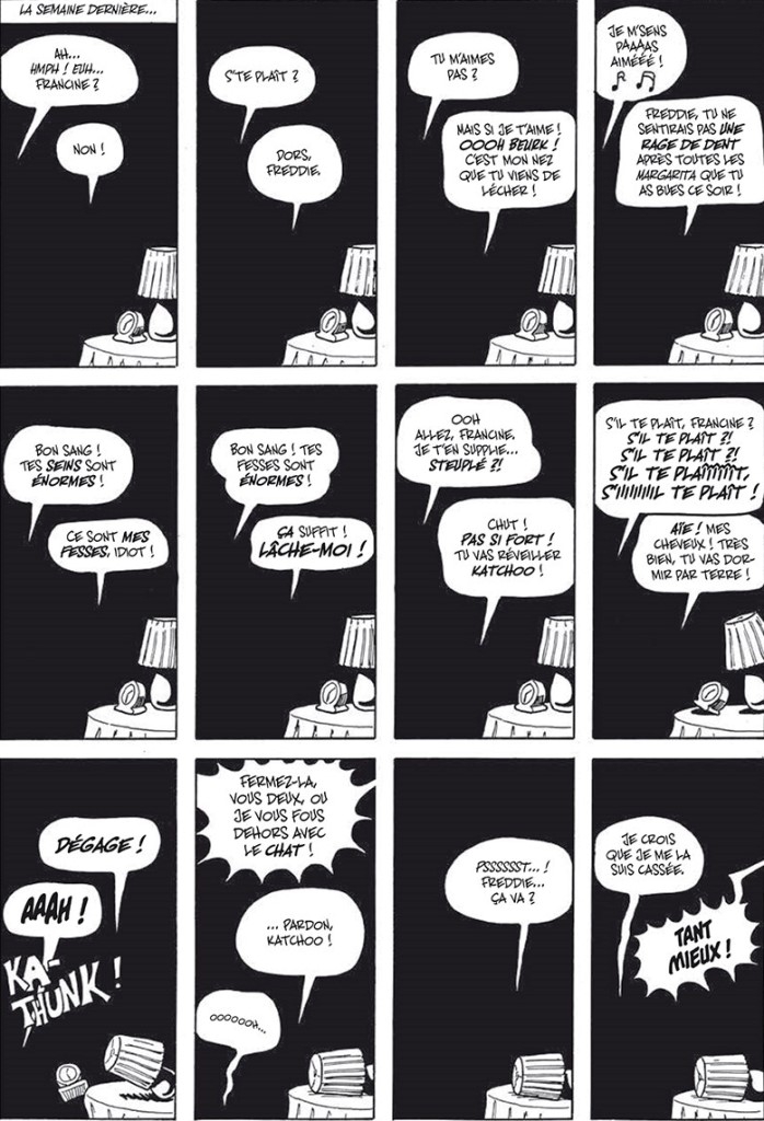Plus de 600 pages en un volume d’1kg500, autant dire que la lecture tient de la performance : la gestion du temps et celle du poids, quelques heures plus tard et une tendinite au poignet, je peux m’autoriser un avis non-définitif car il ne reste pas moins de 1200 pages à lire pour achever le cycle. Que dire ? Les 200 premières pages oscillent entre frasques de copines, vaudeville hétéro ou lesbien, comédie sirupeuse typique des années 90 à la sauce Friends. Puis on passe en mode polar, hard boiled, avec violences, fusillades, prostitution et mafia. A partir de là, c’est lancé et cela ne semble pas vouloir s’arrêter. En effet, ces deux univers vont se développer en parallèles et parfois se téléscoper brutalement, nous faisant passer de la psychologie aigre douce à la noirceur, voire la terreur, pure. Sans oublier les petits intermèdes musicaux, poétiques, érotiques, littéraires. On se sent tout perdu, une fois arrivé au bout de ce premier volume, Francine, Katchoo et David font désormais tellement partie de la vie du lecteur que l’addiction est proche.