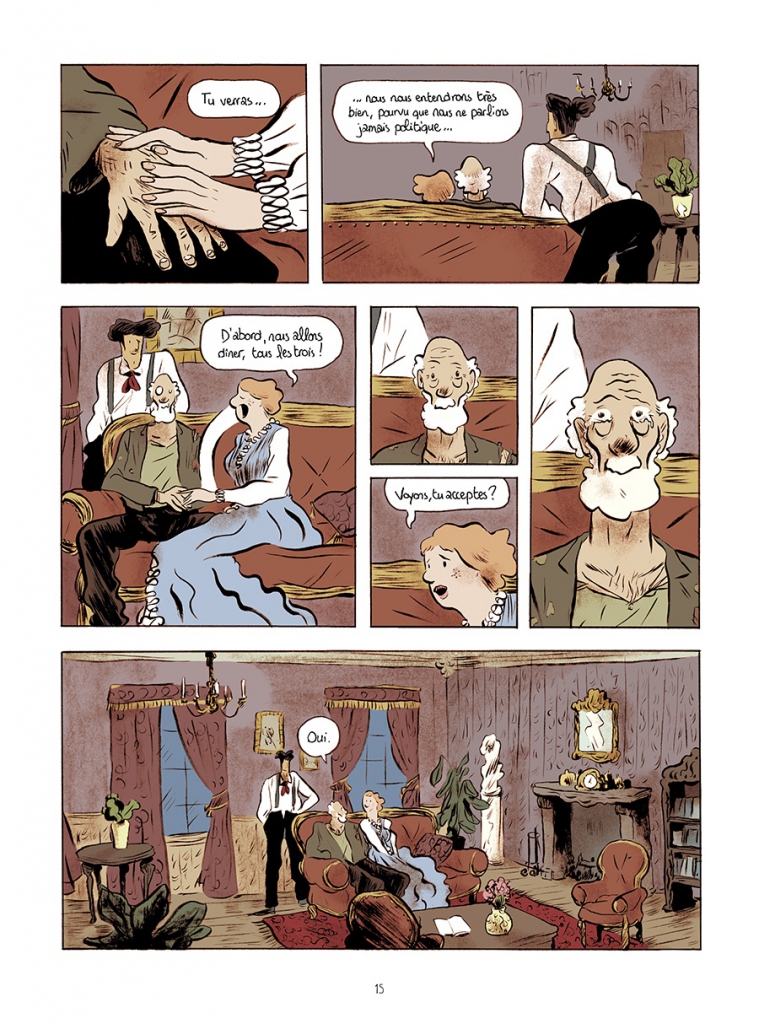 Pour ce qui est de l’adaptation elle-même, les auteurs s’y sont pris de belle manière, collant au plus près du récit, reprenant un maximum de dialogues du texte, mot pour mot, et, surtout, introduisant le personnage de Monsieur Emile (avec un Z comme Zola…). L’astuce narrative qui voit l’auteur de Germinal devenir lui-même un personnage de sa nouvelle me paraît très bien vue car elle permet une narration non linéaire et mieux rythmée, en particulier grâce aux différents points de vue des personnages qui lui racontent tour à tour cette histoire dans l’optique d’une publication ultérieure.