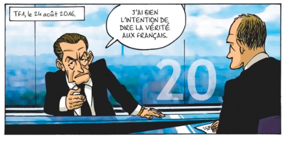 Mais le personnage principal, dans un contexte d’avant-deux tours, lui qui est le seul protagoniste fictif de cet album, lui qui incarne un journaliste issu de la classe moyenne, quel regard porte-t-il sur tout ça ? Pour quel politicien ou politicienne son cœur balance et, d’ailleurs, son cœur balance-t-il pour l’un, l’une ou l’autre ? C’est à ces questions que répond cette BD un peu trop censurée à mon goût et inutile à réaliser si on n’arrive pas à caricaturer tous les élus et élues (ce qui est le cas, pardon de le préciser) de Jean-Luc Mélenchon à Emmanuel Macron, en passant par François Fillon, prudence avec le maniement du crayon !