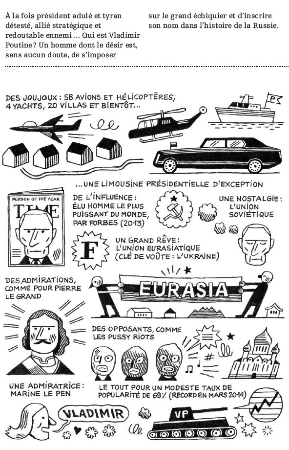 Comme tout le monde, vous vous posez mille et une questions sur Angela Merkel, Vladimir Poutine, Donald Trump, Daesh, la mobilité des jeunes, les drones, la singularité française, la conquête du droit de vote, les défenseurs des océans, les musulmans dans le monde, les atouts économiques de la France, les horaires des salariés Français, le pétrole, la lutte pour les droits civiques, l’histoire du Vatican, du Rwanda, d’Athènes, d’Istanbul, du Qatar, de Singapour ou de Naples, entre autres petits et grands sujets de préoccupation… Chaque semaine depuis 2014, Jochen Gerner explique en bande dessinée ces différentes notions qui permettent de mieux comprendre l’histoire, la science, l’économie, la politique, l’actualité, pour ne pas dire le monde !