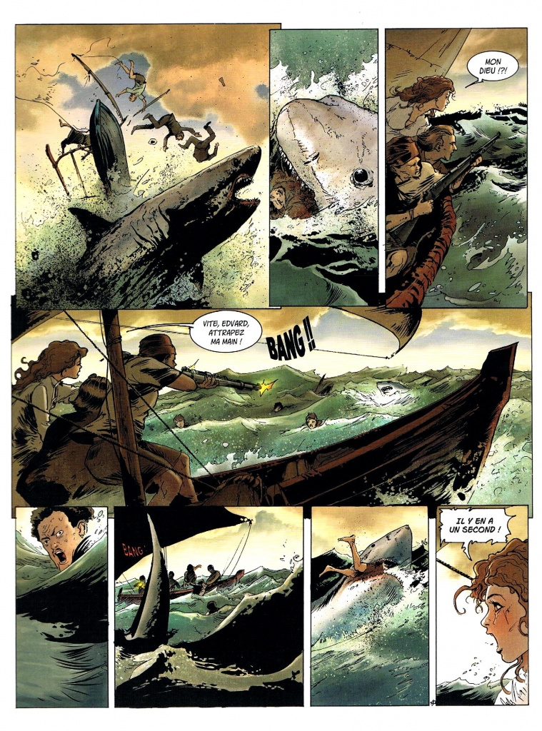 Bravo aux scénaristes Alcante et Gihef qui ont écrit une histoire fantastique où se côtoient superstitions indigènes, croyances chrétiennes et athéisme scientifique. Les personnages du chef de tribu, du psychiatre et du père catholique sont bien typés et leurs idées, mêlées à la volonté de Marie, amie d’Edvard, qui veut le sauver à tout prix, porteront les événements jusqu’à leur conclusion tragique. L’équipée du groupe les fera affronter tous les dangers, dans la jungle, en mer d’Indonésie et, surtout, au sommet du volcan Krakatoa en éruption.