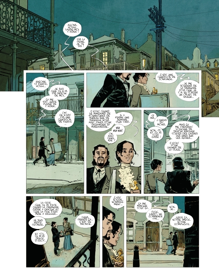 Après la pluie du tome 2, vient le feu du tome 3, celui des révélations sur le passé d’une héroïne qui devient de plus en plus attachante au fil du dévoilement de son histoire personnelle, ainsi qu’au fil de parution des albums, bien sûr. Au bleu/gris de la pluie succède l’orange des flammes. Le trait se fait ici plus épuré, parfois proche du crayonné. Les belles architectures restent de mise, mais ce sont les personnages qui sont placés en évidence. Le rythme narratif alterne des phases de longs dialogues, de scènes contemplatives et d’action mouvementée, intelligemment dosées. La spéculation immobilière, les rivalités féminines, une figure maternelle inquiétante sont autant de thèmes sous-jacents qui donnent au récit son ton et sa saveur