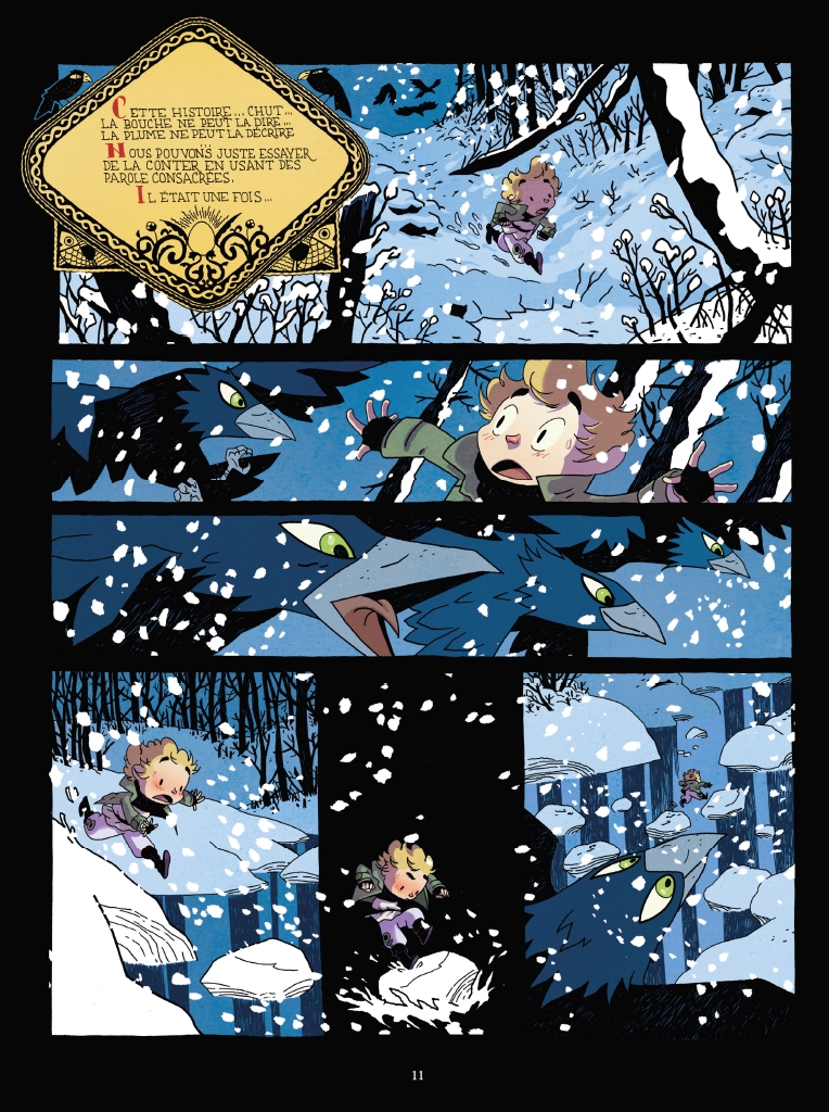Quand on ajoute à cela les magnifiques illustrations pour chaque chapitre, qui semblent gravées dans la roche, telles des dessins dans les flancs des montagnes de neige éternelles : nous voici face à une superbe conte pour enfants qui, en prime, allie le passé dans la poésie de sa narration et le présent en grimant les personnages comme des héros de dessins animés actuels. Ce qui, à mon sens, tue un peu – beaucoup – le charme. Cela n’a pourtant pas diminuer mon intérêt pour cette lecture que je recommande à chaque parent qui souhaite lire à leurs enfants des récits comme ceux que nos parents et grands parents nous lisaient petits.