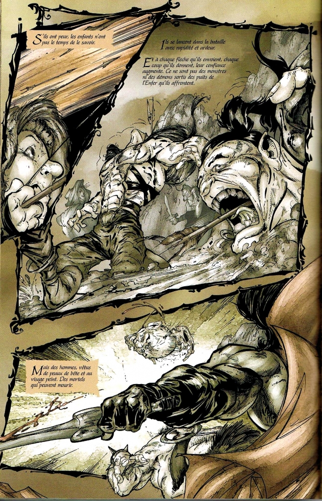 Cependant l’histoire mettant en scène Maeve, jeune vierge conduisant une armée d’enfants et le Hellspawn combattre une horde de tueurs sanguinaires, sauve l’ensemble du volume. Cette épopée lyrique de sueur et de sang, composée de pages aux couleurs sépia, illustrant des combats mortels où les têtes, les bras et les jambes tombent tranchés net par des épées ruisselantes de sang, est une merveille scénaristique et artistique. Rien que pour ce récit l’album mérite de faire partie de votre collection… En fin de volume un belle sélection de couvertures de la série originale et de pages à l’encre raviront les amateurs.