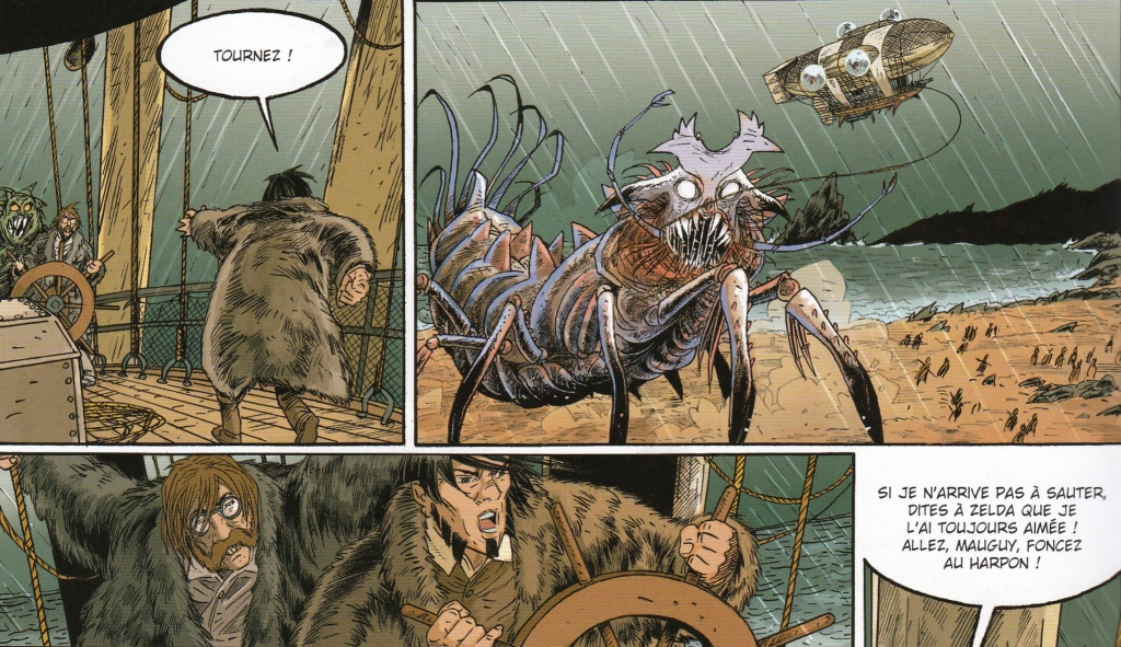 Nous retrouvons cette fois nos héros en Amérique du Sud, accompagnés de personnages plus ou moins récurrents (Mauguy, Charnay…) et de Davy Crockett. Je dois vous avouer que l’intrigue de ce quatrième cycle, avec son Ordre de l’Obsidienne, ne m’a pas vraiment convaincu. Va pour les civilisations avancées et leurs armes ultimes, va encore pour les pirates anthropophages et la Guerre civile américaine des cycles précédents, mais ces histoires de poulpes et autres grenouilles à mâchoires de piranhas qui viendraient d’un océan intérieur au « centre de la Terre », c’est un peu too much à mon goût pour que le récit puisse s’en accommoder sans devenir vraiment farfelu. Si l’on ajoute à cela la fait que la trame narrative est parfois un brin capillotractée et les scènes de batailles souvent très confuses, l’addition commence à devenir salée.