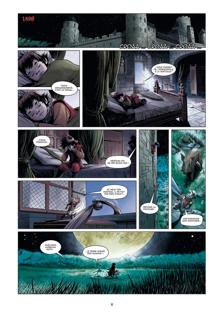 Brocéliande débute en 1467 avec le discours de Guy de Laval le 14e (alors âgé de 38 ans selon les livres d’ Histoire… c’est important car des incohérences sont apparues dans cet ouvrage), expliquant son souhait de construire une route qui traverserait toute la forêt enchantée. Il en est évidemment hors de question pour dame Nature qui décide donc d’amadouer le futur Guy XVI pour plaider sa cause. Sauf que le petit gamin qu’on retrouve au fil des pages devrait normalement avoir dépassé la 20aine aux dates mentionnées dans Brocéliande ! Un peu grand pour monter un sanglier, n’est-ce pas ?!