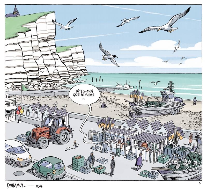 Jamais, c’est d’abord une résistance un peu comme Astérix contre les romains. Comme pour notre gaulois préféré, on y vend du poisson frais mais ici, le combat semble perdu d’avance, puisque Madeleine, une vénérable dame aveugle, se bat contre l’érosion de la falaise non loin de sa maisonnée. Un album très personnel pour Bruno Duhamel pour son lieu (sa famille est originaire de la Côte d’Albâtre) et pour son personnage principal Madeleine (une sorte de mixte de ses deux grands-mères). Un album qui joue la double corde de l’émotion et de l’humour. On se dirait parfois chez les rugbymen ou chez les pompiers avec une pléthore de personnes très bonhommes qui enchaînent les situations souvent rocambolesques. Une mention au chat Baltazar, il m’a bien fait rire celui-là. L’ensemble parait léger et sans coté partisan mais au final on a abordé pas mal de thématiques sérieuses comme la résistance, l’anarchie, la fin de la vie, l’état d’urgence, les forces de la nature…Une bonne déconnexion du cerveau entre rire et compassion assurément.