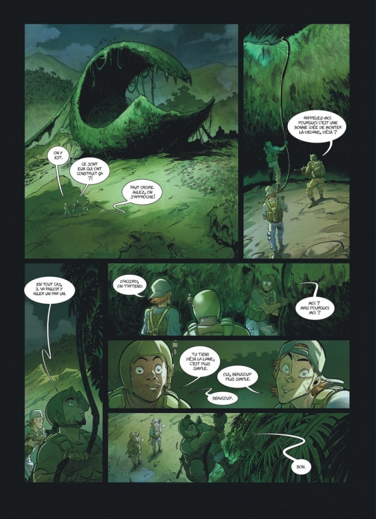 Personnellement j’aime beaucoup « Week-end dans la jungle » par Camboni et Filippi qui dépeint avec – à peine – exagération les dangers de la jungle (croyez-moi car je l’ai vécu, les petites bêtes mortelles sont pléthore) et m’a bien fait rire. D’autres récits comme le sombre « Origines » par Tako et Hamon ou l’émouvant « Les herbes magiques » de Renaud Collin sont plus dramatiques mais font que l’album est assez éclectique. La plupart sont cependant de facture comique et nous font passer un bon moment, espérant que le deuxième tome annoncé soit d’égale facture.