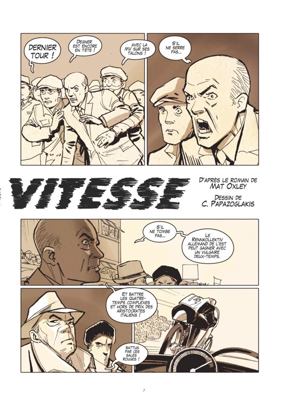 Christian Papazoglakis met en scène ce roman graphique de manière assez brillante. Pas facile pourtant d’évoquer la vitesse, de dessiner les machines de façon réaliste mais sans tomber dans le rendu trop froid et figé de l’hyper réalisme. Il opte pour un trait simple qui va a l’essentiel avec une mise en couleur en bichromie renforçant le caractère historique de l’ouvrage.