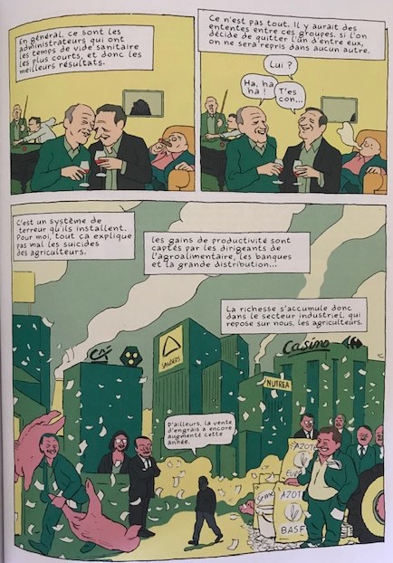 Cette obstination dans le déni, les conflits d’intérêts de certains politiques et industriels, les positions ambiguës des syndicats agricoles, le cynisme des banques, cette difficulté à mettre au jour la vérité et l’évidence … tout cela fait monter au fil des pages un sentiment de révolte, d’écœurement et d’animosité viscérale envers cette classe politique qui fait toujours semblant de faire les choses, mais qui finalement continue de cirer les pompes des grands industriels et des banques.