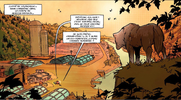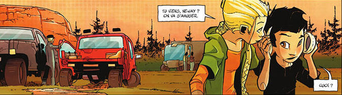 Le traitement graphique d’abord, je préfère parler de traitement graphique que de dessin car il s’agit ici d’un tout parfaitement équilibré et remarquablement travaillé, le traitement graphique, disais-je, me plaît beaucoup même si, de prime abord, j’ai un peu de mal avec le côté particulièrement anguleux et nerveux du trait, notamment concernant les visages. Patrick Boutin-Gagné fait une fois de plus la preuve de son excellente maîtrise du média BD et ce dans tous les domaines. Qu’il s’agisse du découpage, des cadrages ou encore des mouvements, il n’y a rien à redire. Les couleurs d’Aurélie Frémineur contribuent également à la très bonne tenue générale du tout. Par ailleurs, toujours sur le côté graphique, je trouve que le dessin de Boutin-Gagné a beaucoup de caractère… En gros : il a du style !