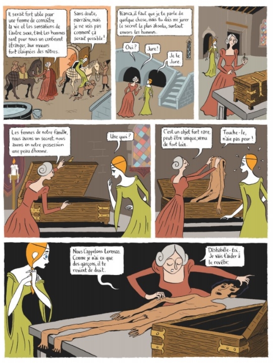 Dans l’Italie de la Renaissance, Bianca, demoiselle de bonne famille, est en âge de se marier. Ses parents lui trouvent un fiancé à leur goût : Giovanni, un riche marchand, jeune et plaisant. Le mariage semble devoir se dérouler sous les meilleurs auspices même si Bianca ne peut cacher sa déception de devoir épouser un homme dont elle ignore tout. Mais c’était sans connaître le secret détenu et légué par les femmes de sa famille depuis des générations : une « peau d’homme » ! En la revêtant, Bianca devient Lorenzo et bénéficie de tous les attributs d’un jeune homme à la beauté stupéfiante. Elle peut désormais visiter incognito le monde des hommes et apprendre à connaître son fiancé dans son milieu naturel. Mais dans sa peau d’homme, Bianca s’affranchit des limites imposées aux femmes et découvre l’amour et la sexualité.