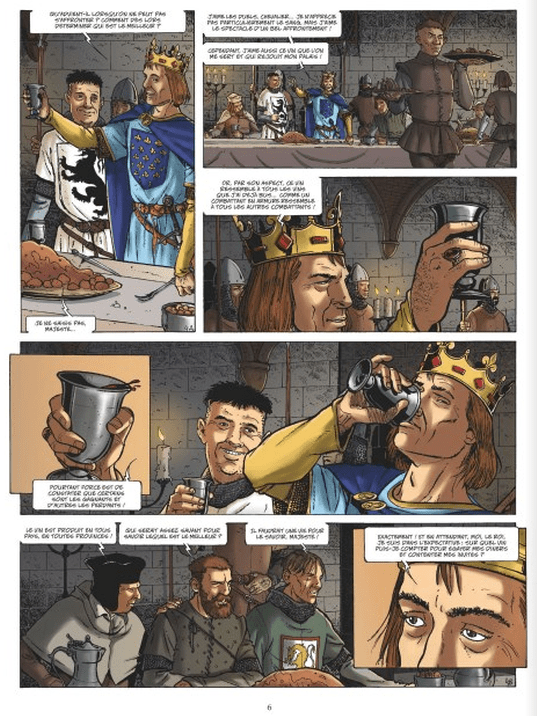 Nous voici plongés dans le Moyen-Age à l’époque du roi Philippe Auguste, roi sage et avisé, grand combattant et amateur de banquets et bien entendu de vin ! Un soir de festivités, il se demande s’il n’est pas possible de classer et hiérarchiser les vins afin de savoir quels sont les meilleurs qu’il pourrait servir à sa table. Pour ce faire, il envoie 27 messagers à travers son royaume afin de partir à la recherche des meilleurs vins. Nous suivrons dans ce tome les pérégrinations de trois marchands différents.