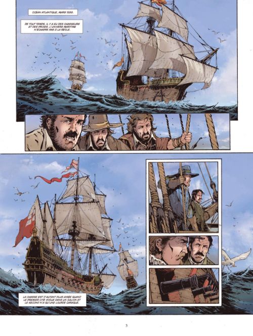 Encore une BD axée sur l’Histoire, je vous avais prévenu que j’en avais quelques-unes sous le coude… Bon, avant de commencer à parler du récit, je tiens à souligner que cette BD est réalisée en collaboration avec le Musée national de la Marine française. Elle contient une préface de Denis-Michel Boël conservateur du patrimoine. Le scénariste M. Delitte est le peintre officiel de la Marine et est membre titulaire de l’Académie des Arts et Sciences de la Mer.