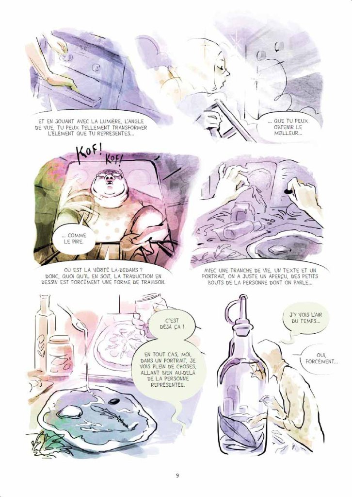 Les dessins sont légers, aériens faits souvent (si je ne me trompe pas) à l’aquarelle ; ils sont parfois flous, peut-être pour évoquer le côté éphémère de certaines de ces rencontres. Je trouve qu’il y a un petit côté onirique, certains portraits ne contiennent que peu de paroles, je ne les ai pas tous compris mais lire le carnet à la fin m’a aidée à mieux les cerner pour certains.