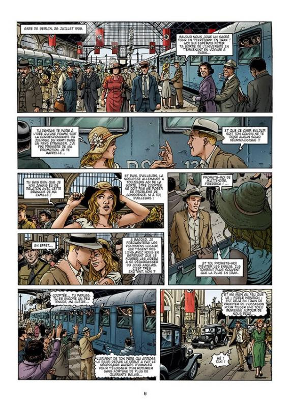 La couverture réalisée par Yvan Villeneuve annonce clairement la couleur. Je suis toujours un peu surpris par ce procédé de donner les clefs de la couverture à un autre dessinateur mais la pratique devient de plus en plus courante. Elle annonce donc la couleur, pas celle très réussie de Hugo Facio mais celle du contenu de ce château des millions d’année. On a sur le chameau ou plus justement sur le dromadaire, notre « héros », un bon aryen au service du IIIe Reich. Une vraie crapule si on n’avait pas judicieusement accès à ses pensées. Le personnage se révèle nettement plus complexe que ce qu’on aurait pu le supposer. A coté de lui, une charmante demoiselle blonde qui est là pour la partie séduction de cette adaptation du roman éponyme. Ensuite, on a des drapeaux nazis avec son triste leader, Adolf Hitler qui nous apporte une indication sur l’époque de cette BD . 1939 pour être plus précis, donc juste avant le début des hostilités. Et enfin, un OVNI pour sa partie « zone 51 ». Bref, de la SF en plein milieu de la 2e guerre mondiale. Une spécialité de son scénariste qui nous avait déjà concocté Wunderwaffen par exemple.