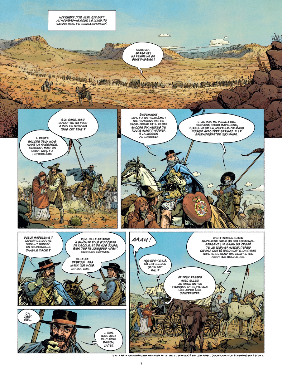 La couverture de cet album, aussi belle soit-elle, est un peu trompeuse et ne laisse pas imaginer que nous ayons affaire à un western, si ce n’est le décor d’arrière plan que l’on ne voit pas au premier coup d’œil. C ‘est pourtant bien le cas, même si l’action se déroule ici à la fin du 18ème siècle plutôt qu’au 19ème comme il est du coutume dans ce genre très codé. Idem pour les protagonistes qui n’ont pas grand-chose à voir avec les habituels cowboys et hors-la-loi qui ont fondé le mythe de l’ouest.