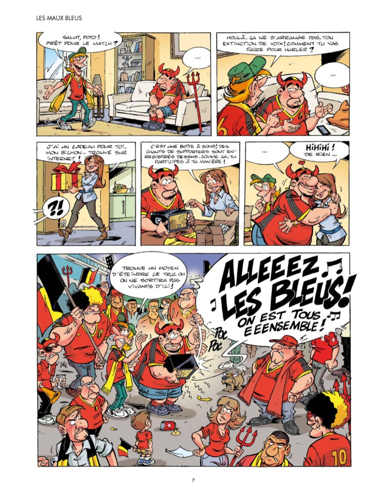 Je ne m’attendais pas à la BD du siècle, c’est sûr. Je me doutais bien que je mettais mes pieds cramponnés dans un produit hautement commercial et formaté pour les fans des diables rouges avec certainement pas mal de contraintes éditoriales. Mais j’espérais autre chose qu’un humour à deux balles de foot option blague à la « Carambar ». Allez, j’ai parfois un peu souri mais j’ai souvent cherché où se trouvait l’humour, j’avais pourtant sorti tout mon attirail de bon supporter mais j’ai eu l’impression de regarder un match de Neymar qu’avec des mauvaises chutes. Le dessin non plus ne brille guère, on a un mal fou à reconnaître nos diables rouges et se limite souvent à caricaturer un trait d’un joueur. De Bruyne, il est roux, Lukaku, une baraque à frites, Hazard avec son numéro 10 et une barbichette, Courtois avec un nez crochu et d’autres qu’on se demande toujours qui ils sont.