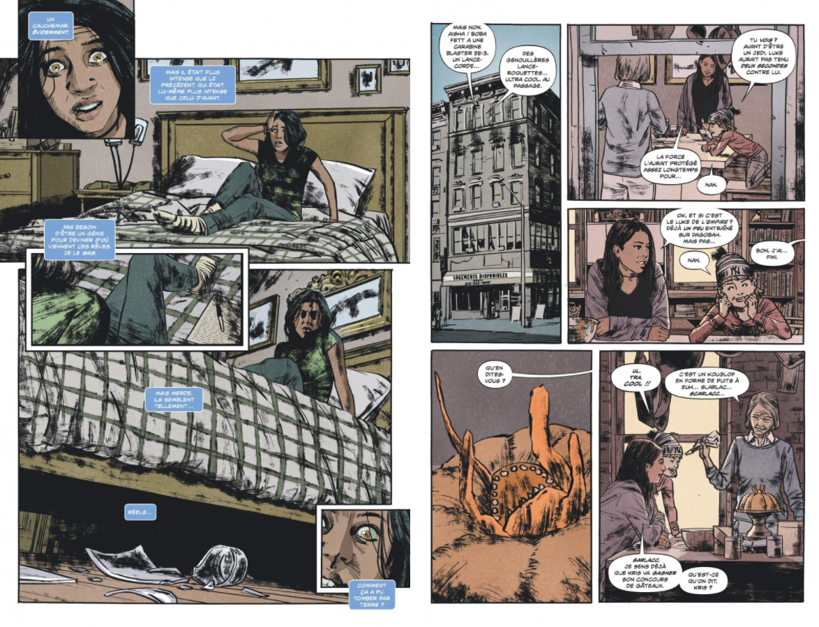 Les dessins de Aaron Campbell (Couleurs : José Villarrubia) fonctionnent très bien avec un vrai travail sur le découpage pour ne pas qu’on déflore  la « surprise » de la page suivante au détour d’un rapide coup d’œil (les yeux du lecteur ont la fâcheuse tendance à vagabonder sur l’intégralité de la page dès qu’elle lui apparait). Seul bémol, son style à la Alex Maleev avec ses dessins utilisant l’imagerie sombre, grainée, qui marquent le lecteur qui y est sensible certes, mais qui va en perdre également rien qu’avec les visuels de cette chronique.