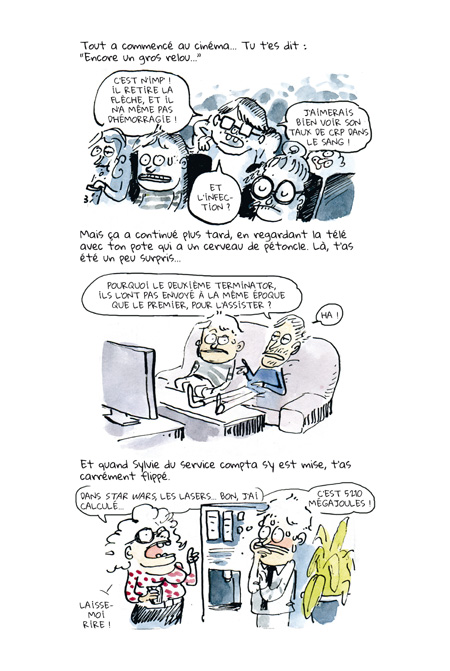 Marion Montaigne propose une vulgarisation scientifique inventive et amusante. J’aime avant tout le ton employé : le professeur Moustache dissèque les séries et autres films avec le scalpel de la vraisemblance scientifique. La méthode est simple : on vous dit ça et » ta ta ta! » c’est pas du tout comme ça que ça se passe. Cela fonctionne totalement, on passe d’un thème à l’autre en se disant: » ben oui bien sûr c’est pas possible quand on y réfléchit « . Mission accomplie donc.