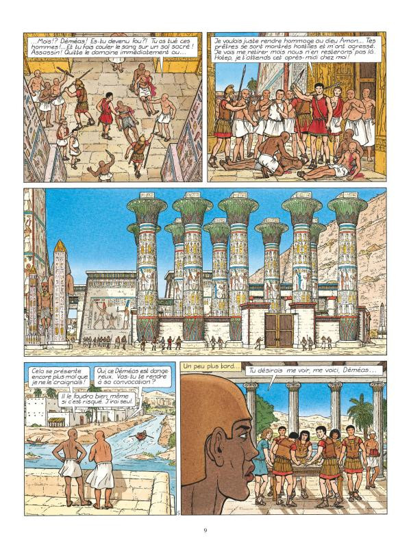 Sous le trait classique, élégant et irréprochable de Rafael Morales, l’Égypte éternelle se révèle plus que jamais terre d’aventures et de magie. Au gré d’un scénario à la minutie historique sans faille, le disciple de Jacques Martin installe un œuvre digne de son maître, une épopée historique au cœur de paysages dorés, faite de drames et de trahisons.
