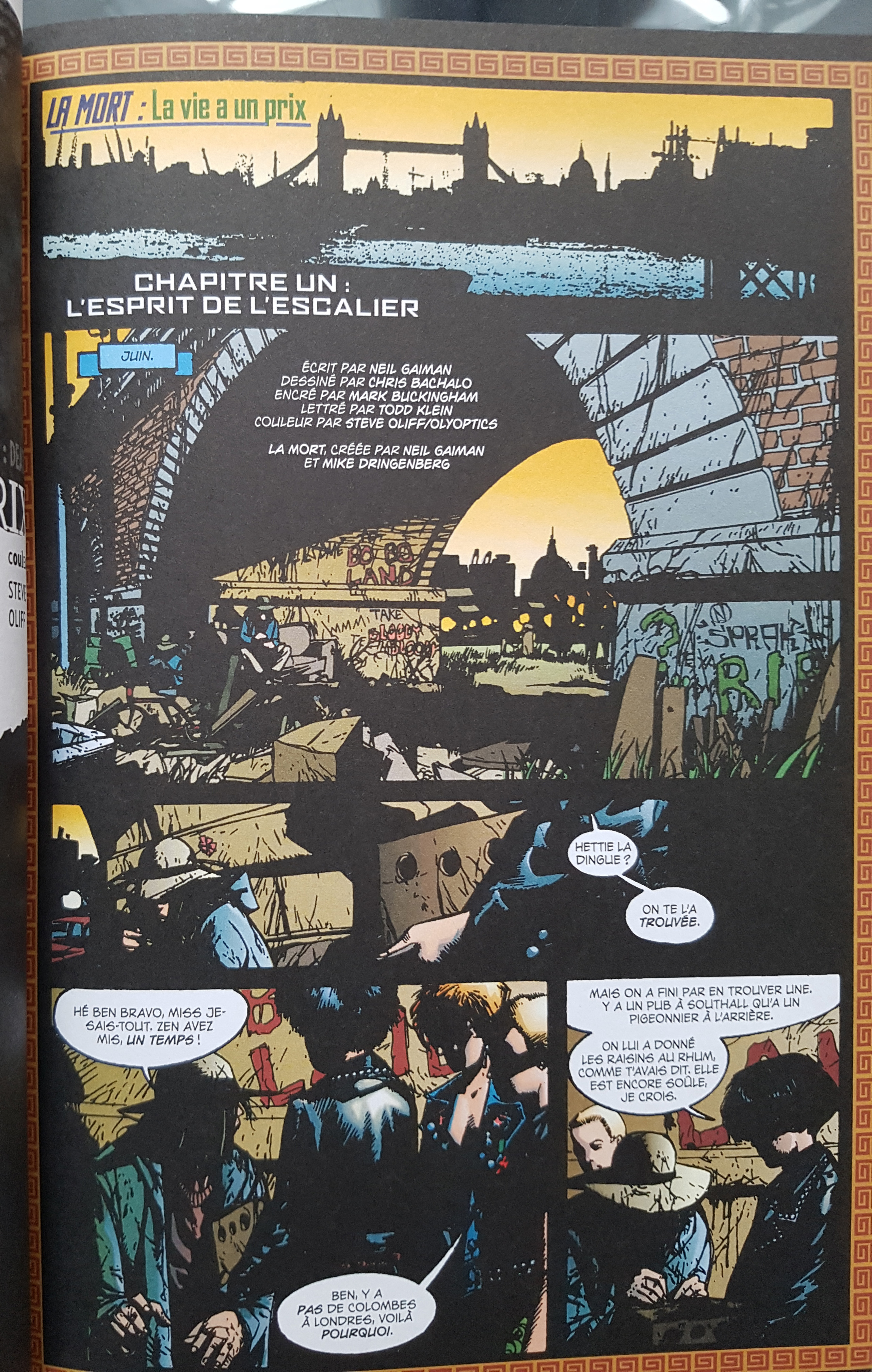 Si comme moi, vous possédez tout ce qui existe sur Sandman et Death en VF, je pense que la quantité de bonus et d’inédits justifie amplement l’investissement. Si vous n’êtes pas encore convaincu (Urban comics n’en fait pas mention sur leur site) cette édition nous propose une toute nouvelle traduction. Aussi, une petite comparaison s’impose. Voici donc ci-dessous une galerie maison avec : la version VO, la VF Panini (trad Geneviève Coulomb), Le Téméraire (trad David Chauvel) et donc la nouvelle traduction de Patrick Marcel chez Urban. J’en profite pour mentionner également Moscow Eye au lettrage et Cécile Rivat pour l’adaptation graphique.