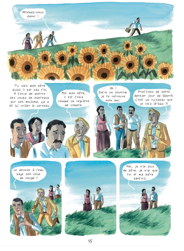 Sa vie, ou tout du moins, le regard des autres sur celle-ci est à la hauteur de ce que renvoient ses peintures. Car ici le maître-mot est la naïveté, celle qui fait penser à l’enfance, à l’innocence, au regard neuf qui n’est pas dénaturé . Ce sont justement les yeux du public qui pèsent sur les épaules de Henri Rousseau. Le procès dont il fut l’objet permet à Mathieu Siam d’offrir au lecteur la biographie enrichissante et agréable à lire d’un homme qui apparait comme à contre-courant, qui n’a pas tous les codes sociaux de son époque. Beaucoup se sont moqués de celui qui a fait bouger les lignes (les frontières) graphiques en mettant, par exemple, les couleurs au premier plan. Thibaut Lambert propose ainsi des petites toiles plutôt que des vignettes ; ce sont les couleurs qui donnent le relief.
