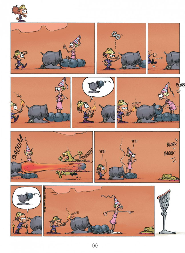 Le principe du jeu vidéo de Game Over ? Un petit barbare (pas toujours super adroit, il est vrai…) doit sauver une princesse (pas toujours super maligne, avouons-le…). De ce postulat limpide, Midam le génie du gag et toute sa team orchestrent des situations toujours plus loufoques et inattendues, dégénérant systématiquement en éclats de rire et d’hémoglobine ! Un humour transgressif mais résolument tous publics.