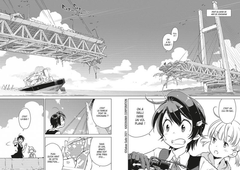 Je me suis laissé guider dans un monde détruit, d’abord à Tokyo, puis dans sa périphérie. Les deux héroïnes apparaissent comme souriantes et candides mais font preuve en même temps de beaucoup d’autonomie et de sang-froid. On se croirait dans le Guide du Routard version nippone mais après la fin du monde. Les planches de paysages surtout urbains sont très réussies tout comme les visages éclairés de Yôkô et Airi.