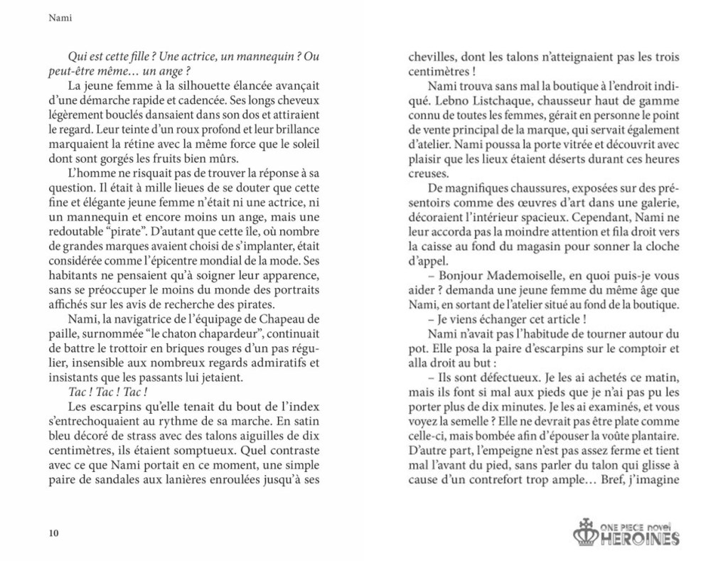 - Nami qui se retrouve dans un défilé de mode après un achat d’escarpins qui font mal aux pieds. Période île poisson il me semble, ce n’est pas très important dans l’histoire.