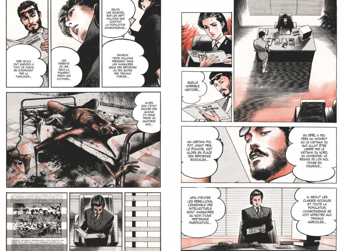La photo trouvée dans l’album précédent permet à Ishihara d’en apprendre plus sur nos protagonistes via la découverte d’un dossier qui nous explicite le lien indéfectible entre Hojo et Asami. (les pages couleurs bichromie en début d’album, voir ci-dessous)