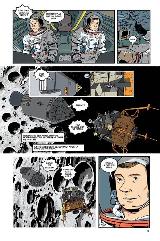 L’illustration en pointillisme de la couverture ne se retrouve malheureusement pas dans les quelques 250 pages qui constituent ce formidable album, et je pèse mes mots. Les différentes étapes de l’aventure lunaire d’Aldrin, Armstrong et Collins, découpées en chapitres sont présentées dans des planches sobres et colorées, elles sont intercalées par des thématiques historiques plus globales, en monochromes. Ce fut d’ailleurs une de mes nombreuses surprises : Jonathan Fetter-Vorm couvre totalement tout ce qui tourne autour de la lune ( humour).
