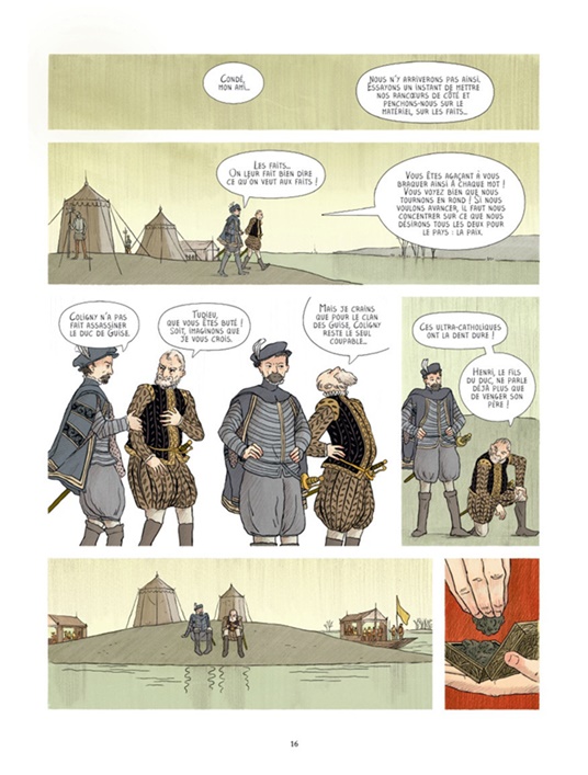 En lisant cette BD, je me suis senti en plein cours d’ Histoire avec un focus sur la période du 16e siècle et sur le règne de Catherine de Medicis. Une Catherine qui essaie d’être au-dessus de la mêlée et de concilier la liberté de conscience et la liberté de culte avec une politique de réconciliation mais comme toujours quand on parle de religion, ça part souvent en couille. Une image de la monarque peu commune et qui est peut être plus proche de la vérité de l’imaginaire populaire qu’on a retenue au fil des siècles.