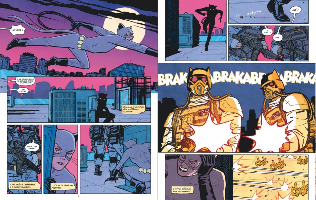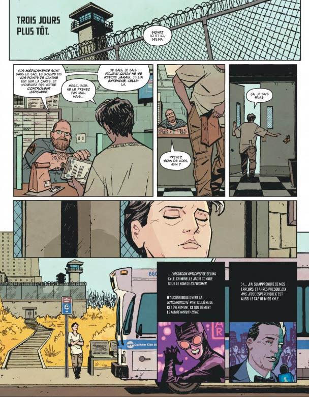 Le résumé éditeur en parle rapidement, mais cet album est surtout l’histoire d’un dernier coup, un dernier cambriolage et pas n’importe lequel : celui de la Batcave. C’est dans ce but que Selina va mettre à contribution ses amis, pour la plupart des ex vilains reconvertis ou sur le retour (mais pas que) : l’action se déroulant dix ans après la mort de Batman, je le rappelle. Je vous laisse la surprise de l’identité de ses complices, mais il y a de vraies bonnes idées dans la galerie de personnages de l’album.
